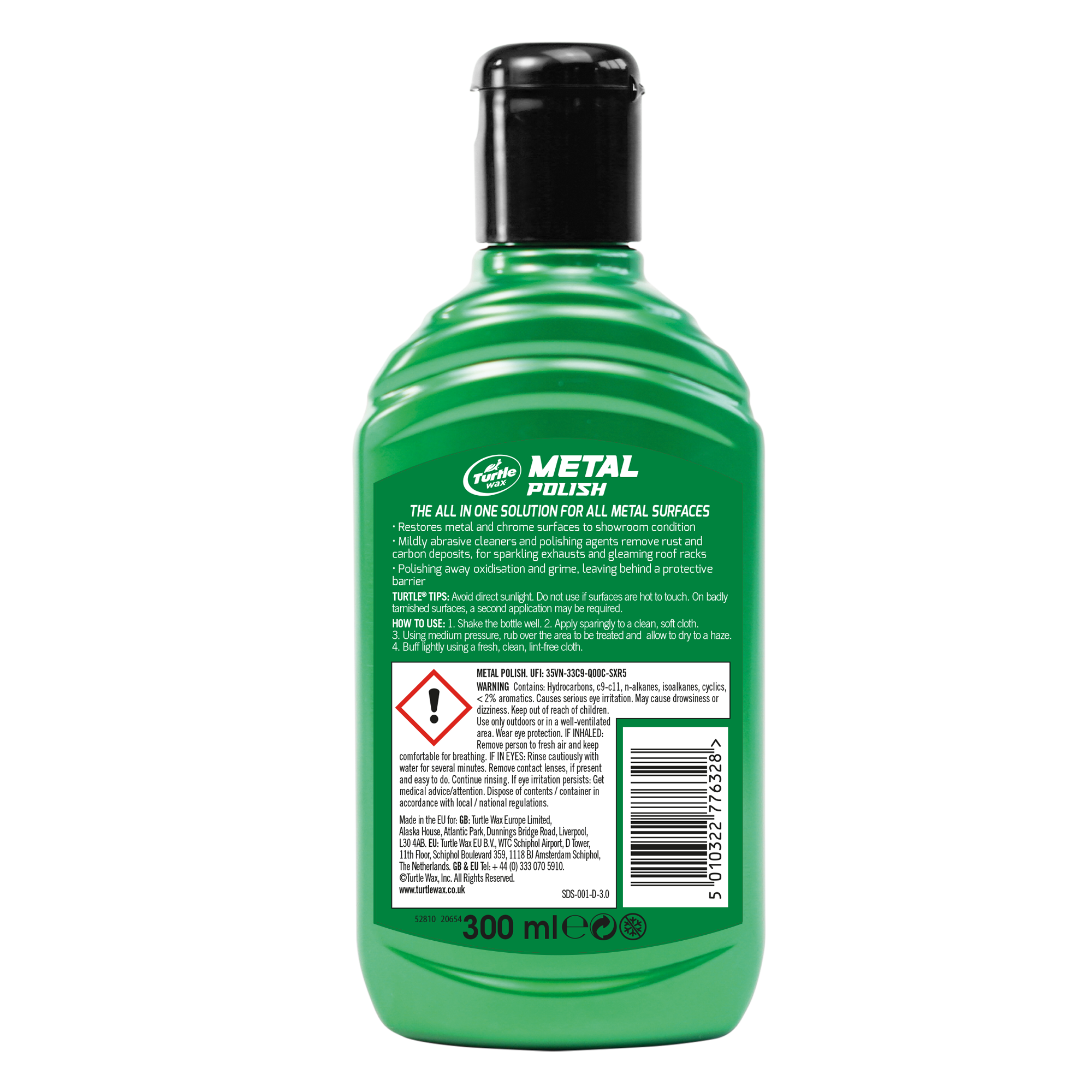 Поліроль-реставратор металевих поверхонь Turtle Wax ALL METAL POLISH - це спеціальна поліроль для металевих елементів кузова, призначена для чистки й відновлення характерних забруднень металу – окислень, іржі, хімічних пошкоджень металу, гальмівного пилу, плям різного походження. Засіб призначений для будь-яких металевих елементів – алюмінію, сталі, хрому, латуні, міді. Має подвійну дію - містить реагенти для розм’якшення іржі, бруду тощо й дрібні абразиви для відновлення поверхні. Надає хромованим елементам первозданного блиску й захисту. Переваги Поліроль-реставратор металевих поверхонь Turtle Wax ALL METAL POLISH: • працює з будь-якими металевими поверхнями, в тому числі хромованими; • шліфувальні частинки ефективно прибирають сліди іржі, окислення, бруду тощо, не пошкоджуючи зовнішній вигляд металу; • після реставрації створює захисну плівку, що запобігає повторному псуванню металу; Застосування Поліроль-реставратор металевих поверхонь Turtle Wax ALL METAL POLISH: 1. Попередньо змийте сильний бруд і пісок з поверхні. 2. Нанесіть невелику кількість засобу на рушник з мікрофібри або губку. 3. Почніть протирати металеві поверхні, які потребують поліровки. У процесі рушник почорніє, що вказує на роботу засобу. 4. Видаліть сліди засобу чистим рушником і розполіруйте поверхню до блиску. Альтернативне застосування: засіб може використовуватись у побуті на будь-яких нефарбованих металевих поверхнях, які потребують реставрації. Поради виробника: не рекомендується обробка на гарячому кузові та/або під прямими сонячними променями, оскільки засіб швидко висихає і його ефективність може зменшитись. При поліровці використовуйте помірно-сильне натискання і рухи у різних напрямках. Не використовуйте на фарбованих і пластикових поверхнях, в тому числі фарбованих під хром або інших пластикових елементах. Зберігання та догляд: зберігайте продукт у межах від 0 ºC до +40 ºC. Не допускайте зберігання під прямими сонячними променями або поблизу гарячих поверхонь. Не допускайте замерзання продукту.
